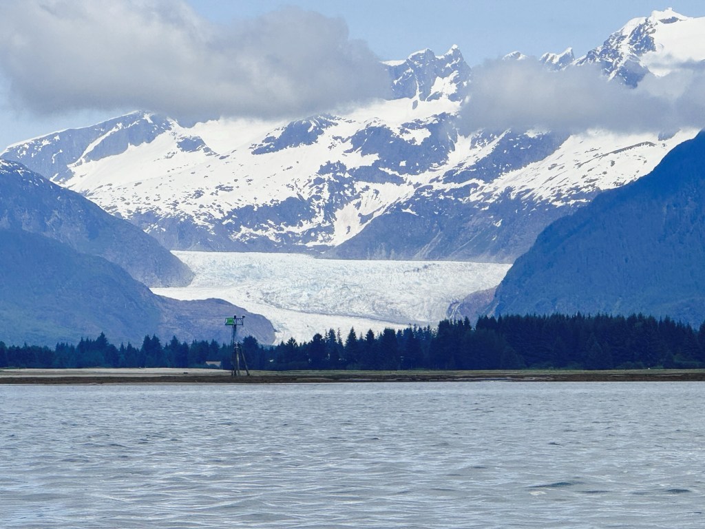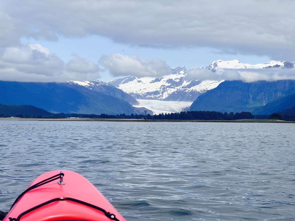 The water was calm and glassy, the kind that makes each paddle stroke feel satisfying. In the distance, we could see the Mendenhall Glacier, its icy mass reflecting soft light through a break in the clouds. The air smelled freshâlike salt and pine.